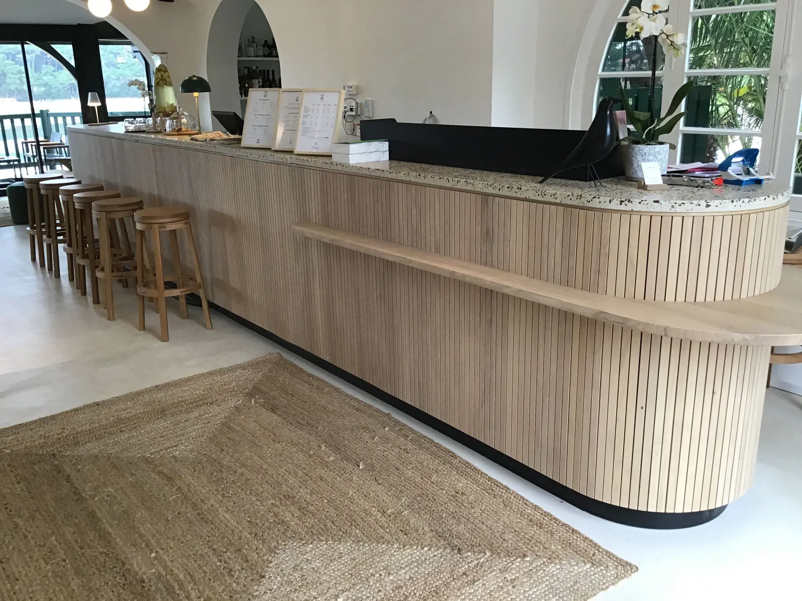 Notre mission était de concevoir, fabriquer et installer deux bancs d’accueil sur mesure, pensés pour l’entrée.