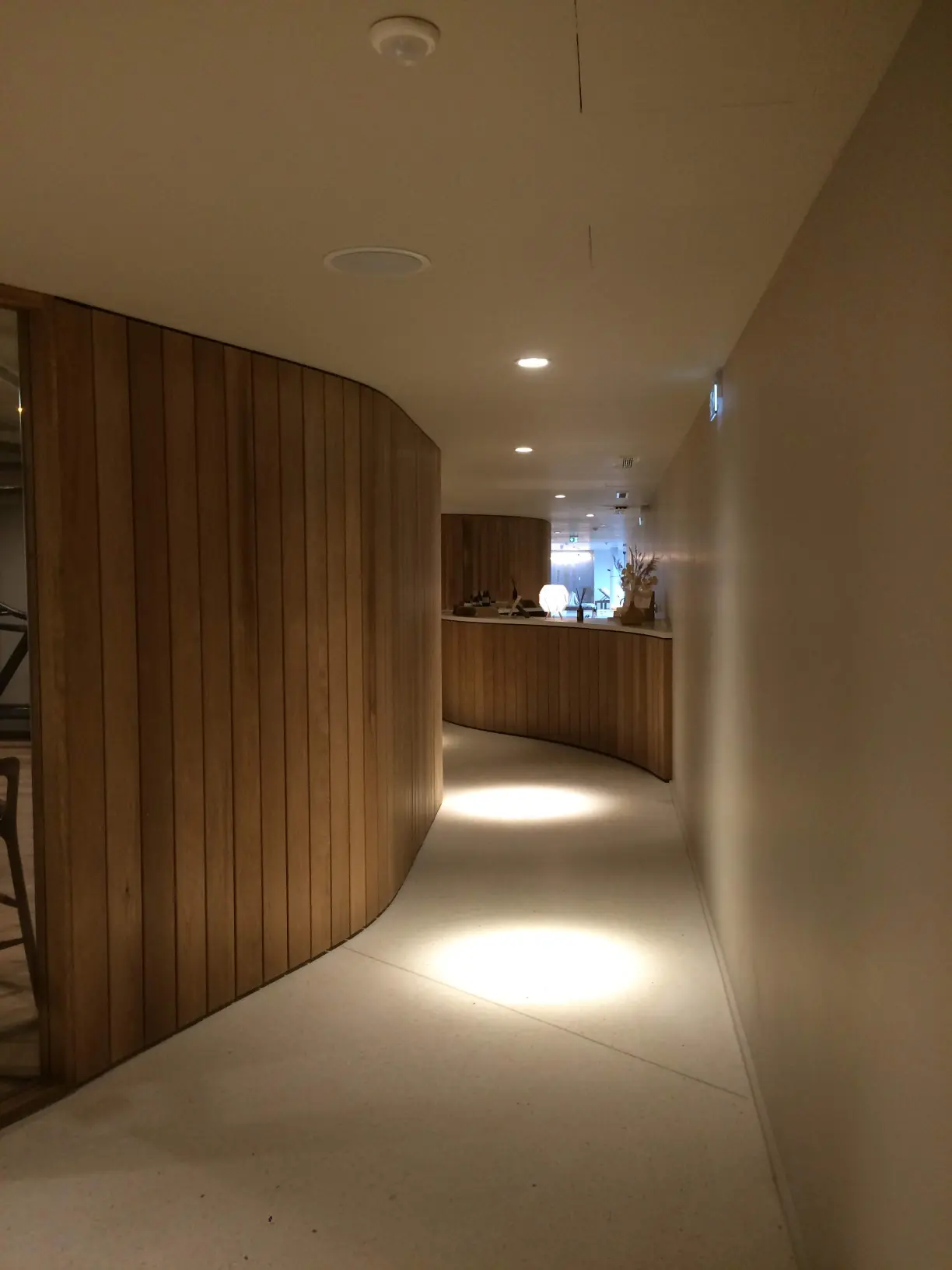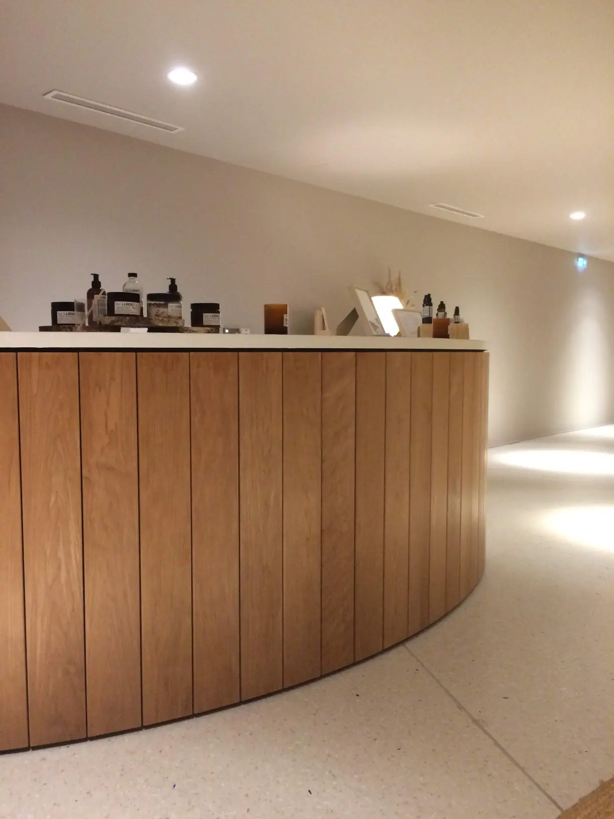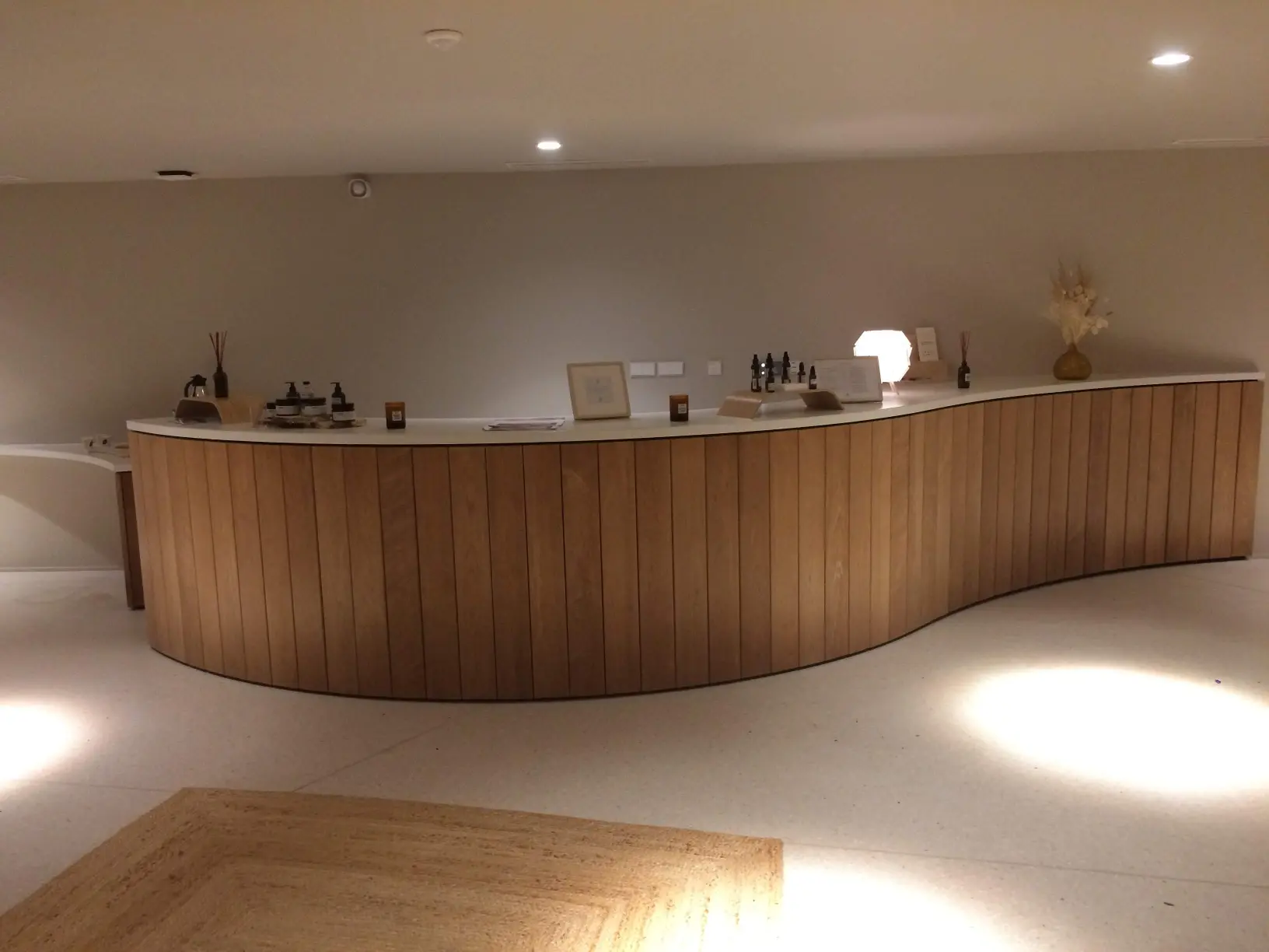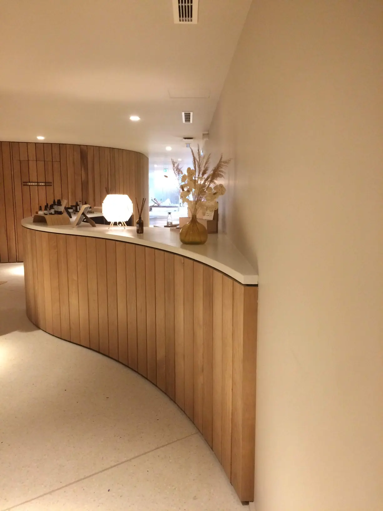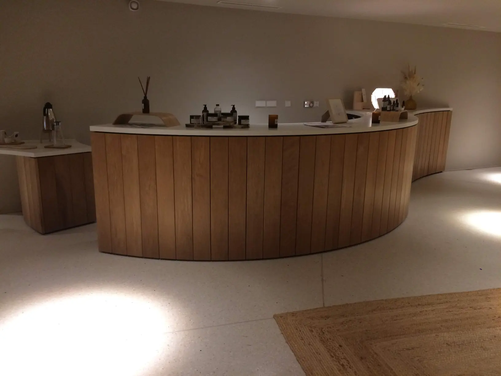 Un ensemble en lames de tremble, un choix technique autant qu’esthétique. Ce bois offre une résistance exceptionnelle à l’humidité et à l’eau, parfaitement adapté à l’environnement d’un spa. Il a été choisi dans une teinte claire en harmonie avec le lieu.