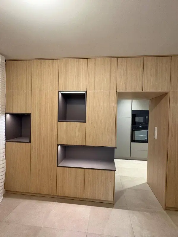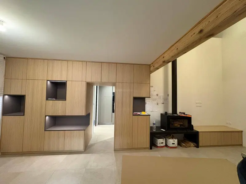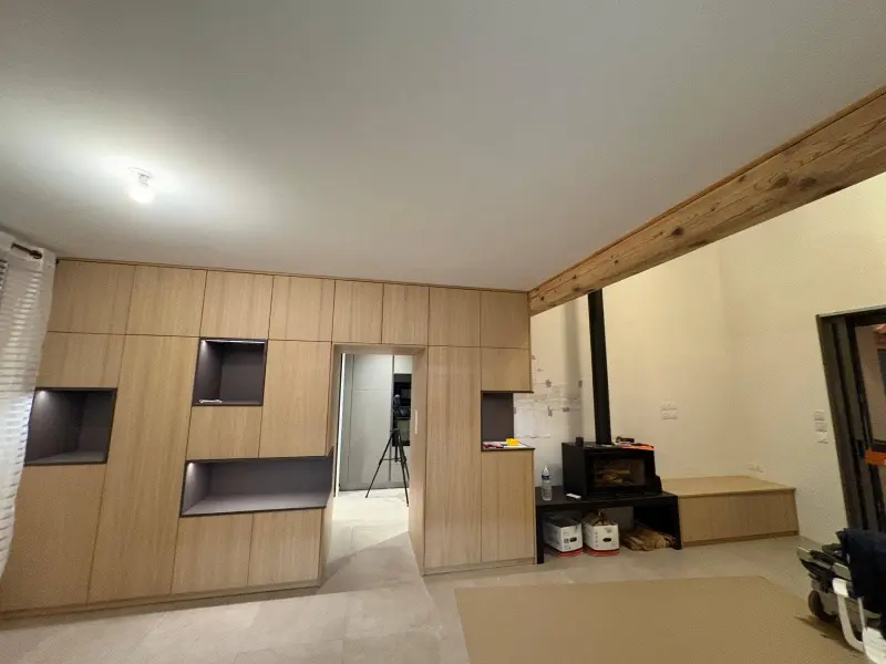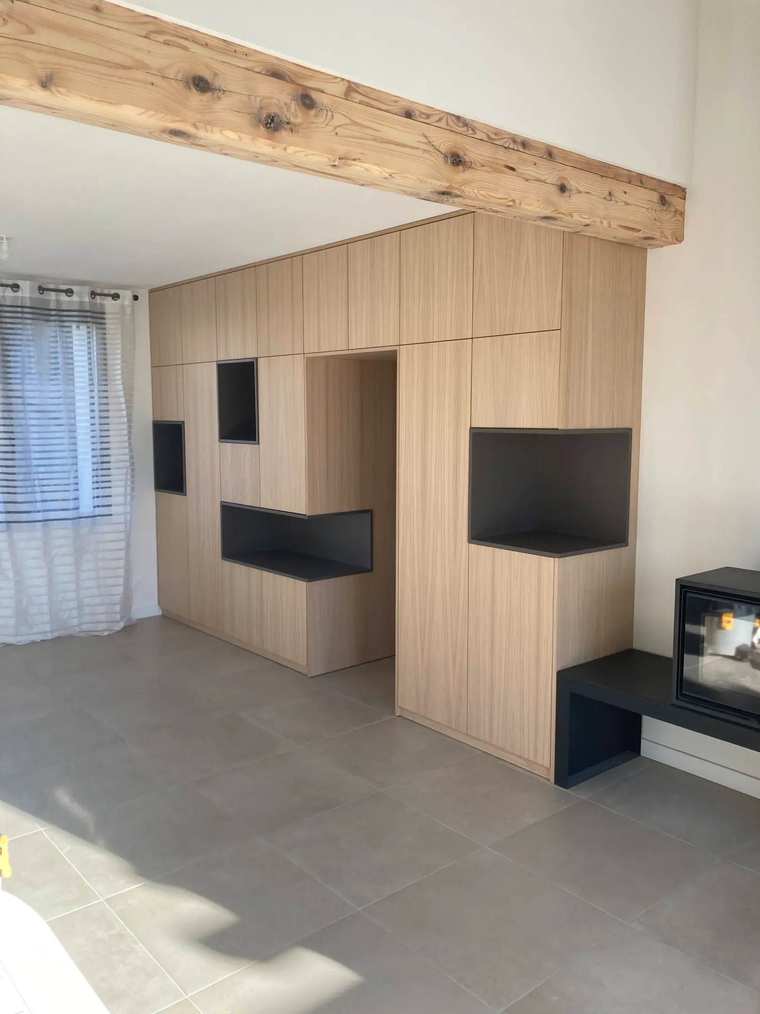 Il s’agit de la création, fabrication et pose d’un meuble de salon sur mesure, pour un particulier, lors de la rénovation de sa maison. Les façades du meuble sont en chêne vernis avec des niches éclairées en MDF laqué noir.
