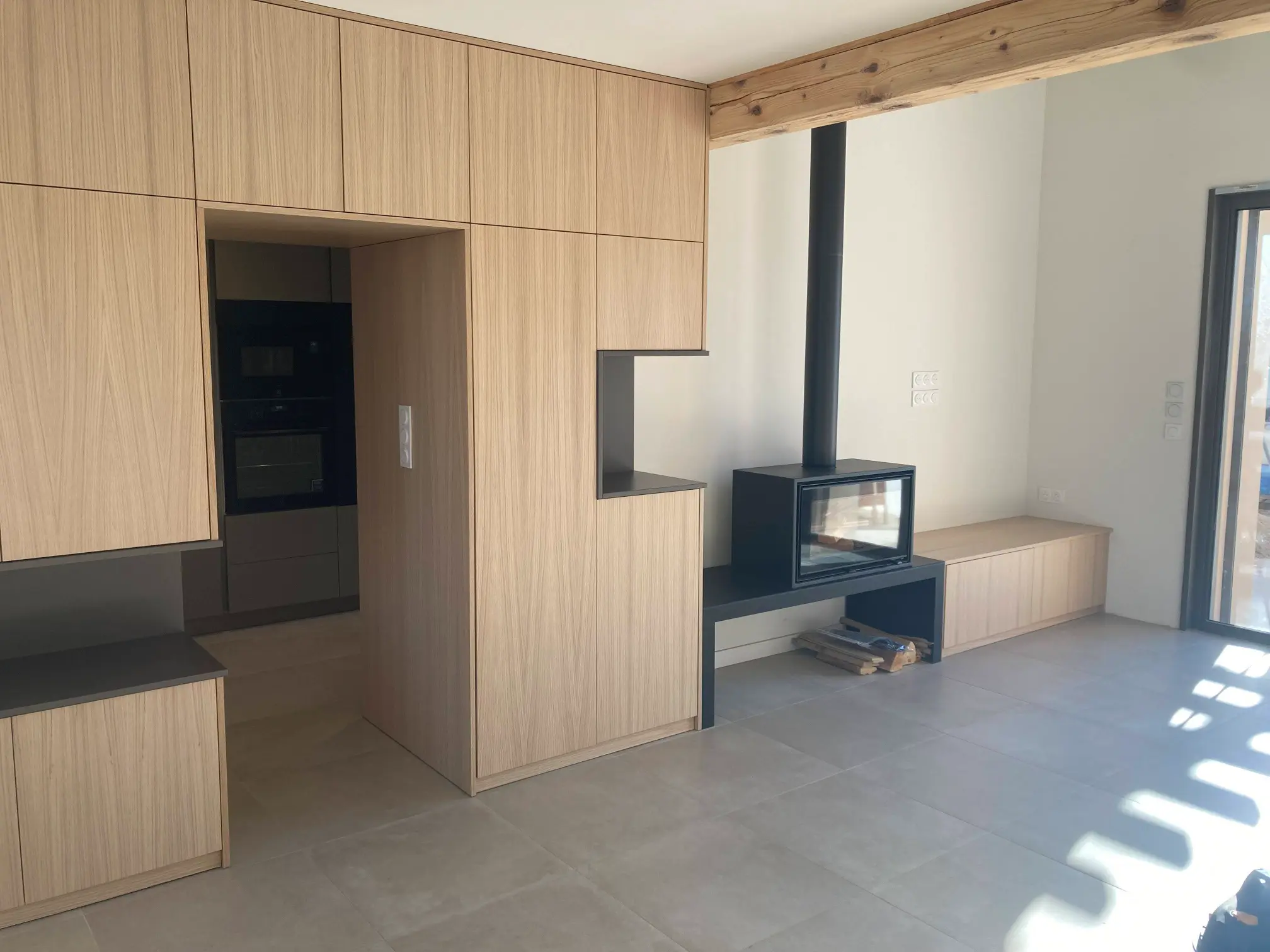 L’enjeu était d’intégrer le poêle, avec ses rangements à bûches et un petit banc pour s’installer au chaud. On a rendu l’espace cosy et fonctionnel. Tout s’articule autour du poêle. Les rangements sont optimisés sans sacrifier l’esthétique.