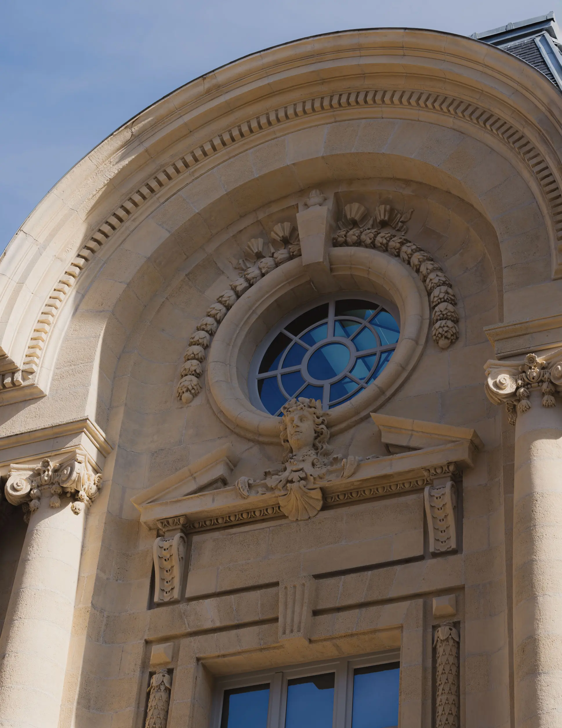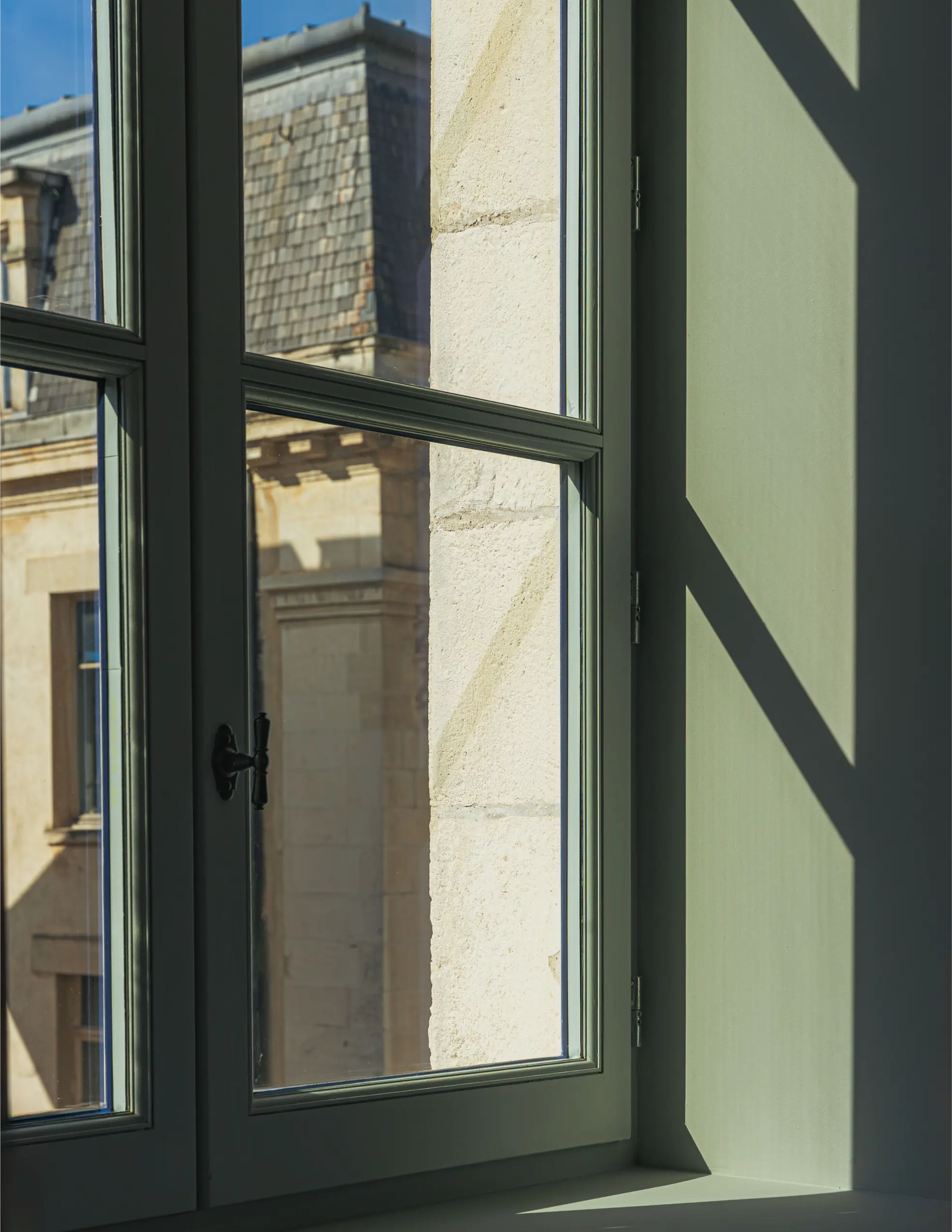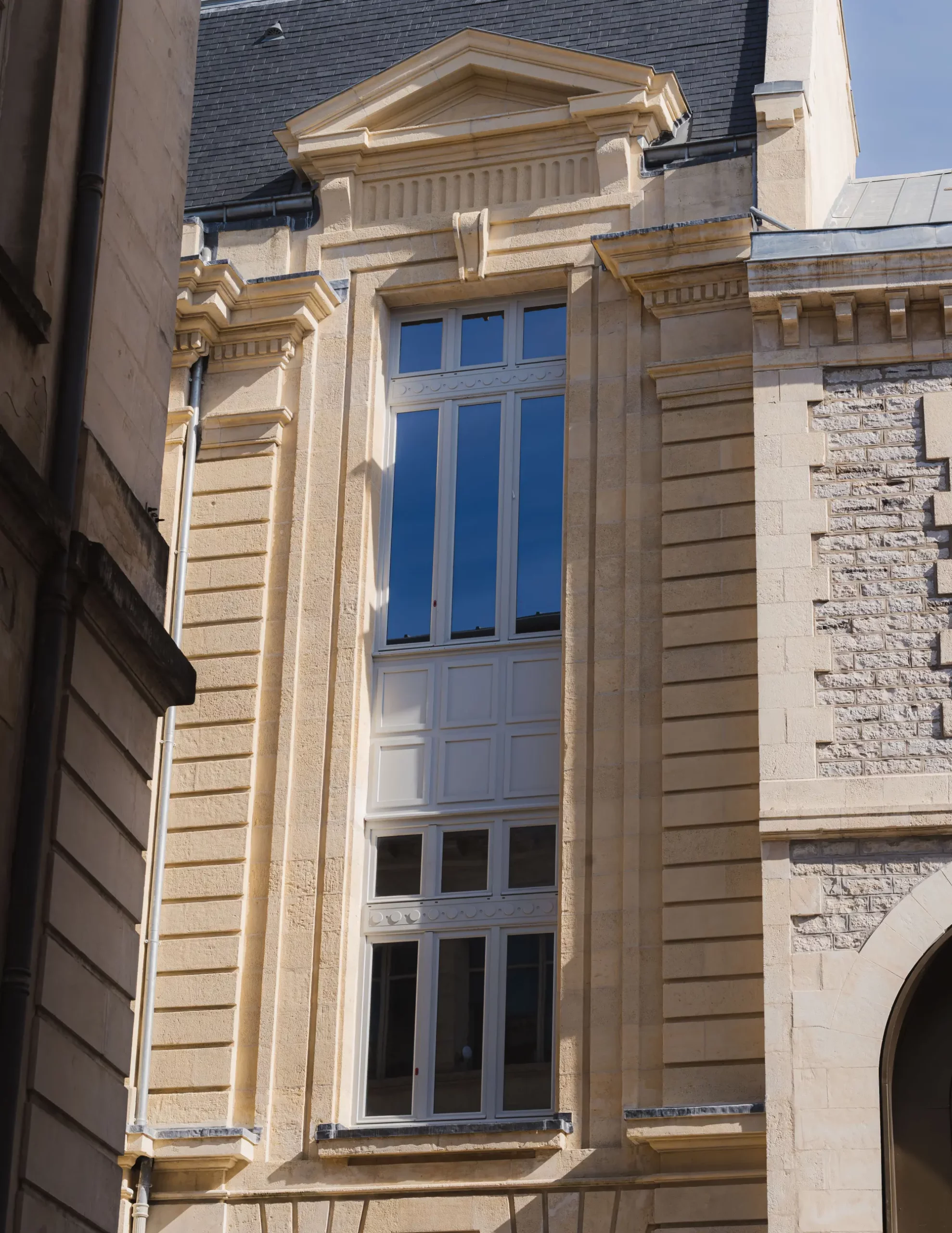 La rénovation des menuiseries a représenté un véritable défi technique et esthétique avec plus de 60 cadres de fenêtres sur mesure, une fenêtre monumentale de 7 mètres de haut à l’entrée et les emblématiques fenêtres œil-de-bœuf au coin du bâtiment.